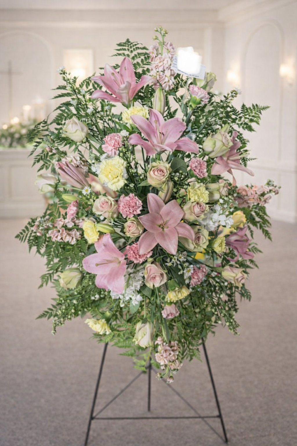 Warm yellow carnations add light and contrast.